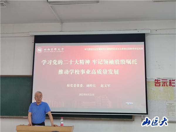 赵文军所做题为《学习党的二十大精神 牢记领袖殷殷嘱托 推动学校事业高质量发展》的党课。党课内容围绕学习贯彻党的二十大精神这条主线,结合习近平总书记历次考察调研山西重要讲话重要指示精神,从“夯实信仰之基,学深悟透党的二十大精神”、“扛牢重大使命,扎实推进中国式现代化的山西实践”、“牢记领袖嘱托,为推进中华民族伟大复兴贡献山医力量”三个方面与学院师生进行面对面交流,启迪师生如何学有所悟、学有所得,如何更好的开展工作和成长成才。