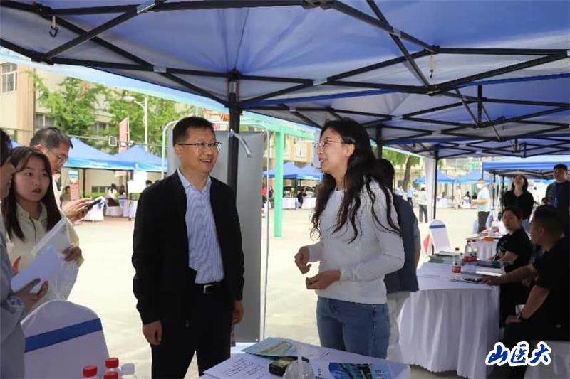 本次招聘会吸引了省内外近60家医疗卫生机构、医药企业和高等教育单位参会,提供就业岗位1800余个,覆盖临床医学、护理学、药学、公共卫生、医学检验等多个专业领域。王军在现场与多家用人单位代表沟通交流,积极推介我校毕业生。