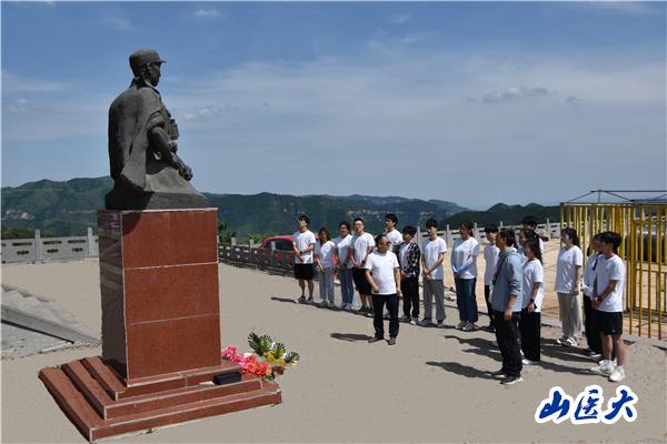 6月24日下午,实践队驱车来到位于左权县城南60余公里的麻田镇北艾铺村南十字岭峰顶的左权将军殉难处。全体实践队师生向左权将军铜像敬献了精心准备的花圈并三鞠躬致敬,花圈外围由黄色和白色的花朵组成,象征着庄严肃穆和无限哀悼,花圈中间是一朵鲜红的大红花,表示实践队师生追寻红色血脉、赓续左权精神的初心使命会代代传承。
