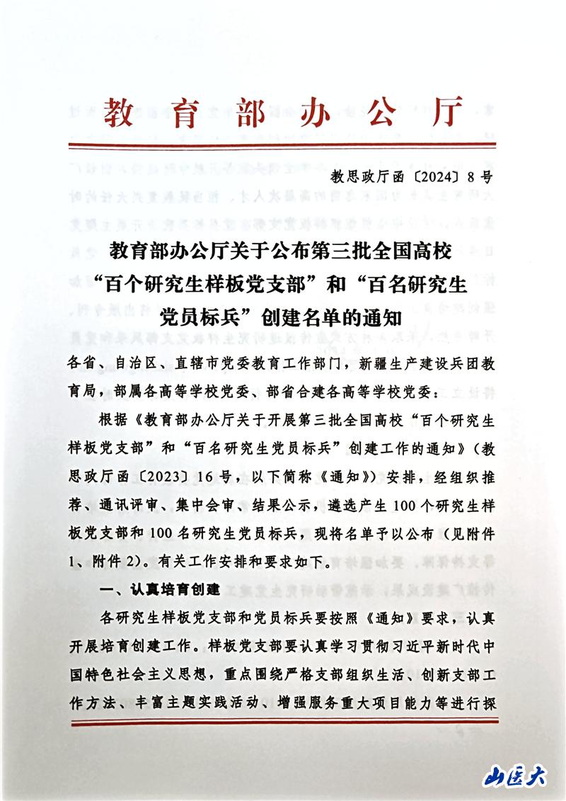 近日,教育部办公厅下发了《关于公布第三批全国高校“百个研究生样板党支部”和“百名研究生党员标兵”创建名单的通知》,我校管理学院社会医学与卫生事业管理学专业研究生王灿荣获“百名研究生党员标兵”。