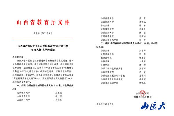 近日,省教育厅在个人申报、学校推荐的基础上,评选出首届山西省“高校辅导员年度人物”10人和“高校辅导员年度人物提名”10人。我校辅导员吴晓兵荣获首届山西省“高校辅导员年度人物”称号。