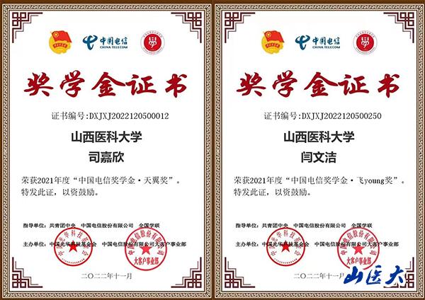 近日,由共青团中央、全国学联指导,中国电信集团有限公司、中国光华科技基金会联合举办的2021年度“中国电信奖学金”推报活动结果揭晓,经校级、地市级分别推荐、省级初评和全国评审,最终确定“中国电信奖学金·天翼奖”获得者98名,“中国电信奖学金·飞Young奖”获得者1486名。我校人文社会科学学院司嘉欣同学荣获“中国电信奖学金·天翼奖”,第一临床医学院闫文洁同学获得“中国电信奖学金·飞Young奖”,其中“中国电信奖学金·天翼奖”山西省仅3人获得,是我校学子第一次获此荣誉。
