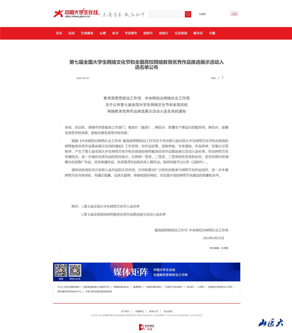 自2023年9月第七届全国大学生网络文化节和全国高校网络教育优秀作品推选展示活动开展以来,学生工作部网络思政教育中心高度重视、精心谋划、统筹安排,动员全校师生踊跃参与,组织专家对上报作品进行遴选和精心打磨。推荐11个优秀网络文化作品参加“山西省2023年大学生网络文化节”,获得一等奖一个,二等奖两个,三等奖三个。