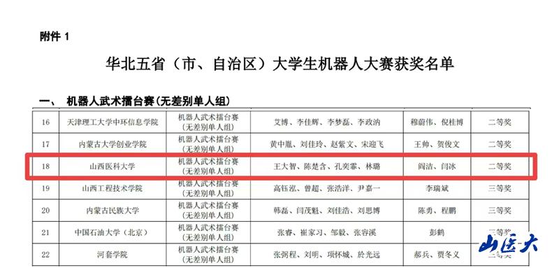11月16日,华北五省(市、自治区)大学生机器人大赛决赛在北京信息科技大学落下帷幕。由我校计算机教学部阎洁和闫冰老师指导,2023级信息管理与信息系统专业王大智、智能医学工程专业林璐、临床医学(5+3一体化新医科智能医学)专业孔奕霏及2024级护理学专业陈楚含四位同学组成的“逐月”团队在机器人武术擂台赛(无差别单人组)中一路披荆斩棘、力争上游,最终以排位赛第4名、总排序第18名的优异战绩喜获二等奖,实现了我校在国家级大学生机器人赛事中零的突破。