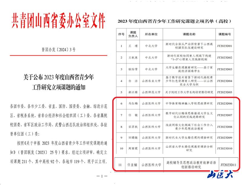 2月18日,共青团山西省委办公室公布2023年度山西省青少年工作研究课题立项名单,我校申报的6项课题获批立项。