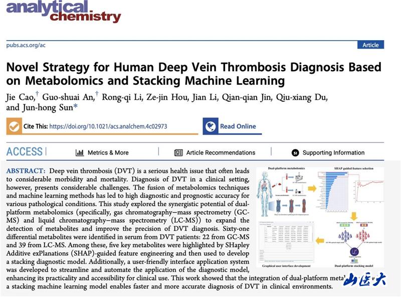 近日,由我校法医学院曹洁副教授和博士生安国帅为共同第一作者,孙俊红教授担任通讯作者的科研团队在国际分析化学领域顶级期刊《Analytical Chemistry》(中国科学院一区TOP期刊,影响因子6.7分)发表了题为“Novel Strategy for Human Deep Vein Thrombosis Diagnosis Based on Metabolomics and Stacking Machine Learning”的研究论文(https://pubs.acs.org/doi/10.1021/acs.analchem.4c02973),标志着代谢组学与机器学习技术结合在深静脉血栓形成(DVT)诊断中的再次突破。