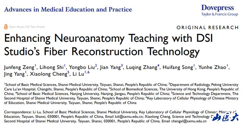 近日,我校基础医学院联合第二临床医学院,协同香港大学、南京医科大学和长治潞安医院,在医学教育国际期刊《Advances in Medical Education and Practice》发表题为“Enhancing Neuroanatomy Teaching with DSI Studio's Fiber Reconstruction Technology”的论文。我校基础医学院解剖教研室曾俊峰讲师为第一作者,陆利教授与成晓龙教授为共同通讯作者。