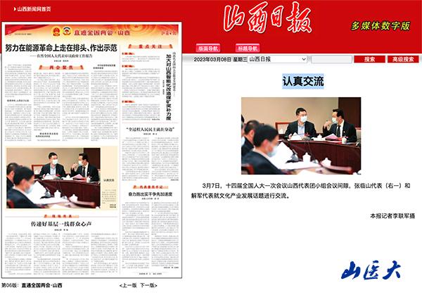 3月7日,十四届全国人大一次会议山西代表团小组会议间隙,张临山代表(右一)和解军代表就文化产业发展话题进行交流。