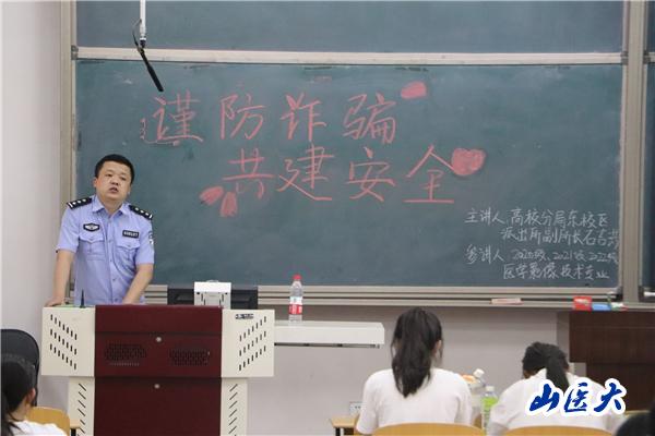 近年来,电信网络诈骗犯罪屡有发生,为增强学生的防骗意识,从源头上预防电信诈骗,更好地保护学生的财产和人身安全。5月18日19时,晋中市公安局高校分局东校区派出所副所长石吉洪警官受邀为医学影像学院2018级-2022级本科生开展了“谨防诈骗,共建安全”专题讲座。